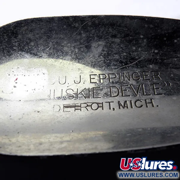 Con un peso di ben 3 1/4 oz (91 g), questo ondulante heavy-duty è progettato per il casting in acque profonde o la traina a predatori da trofeo. Questo esemplare Eppinger, noto come Huskie Devle (codice prodotto 0245), misura una lunghezza considerevole di 5 1/2" (14 cm). La classica finitura Rosso / Bianco sul davanti è arricchita da una distintiva texture a nido d'ape che ricopre le sezioni bianche. Girando l'esca si rivela il retro in cromo stampato, chiaramente marcato con il nome "EPPINGER HUSKIE DEVLE" e l'origine "DEARBORN, MICH.", che data questo oggetto a dopo il trasferimento dell'azienda nel 1959. Una caratteristica unica di questo specifico modello è la piccola paletta vibrante gialla attaccata all'anello elastico posteriore, decorata con diamanti rossi e l'iconico logo a testa di diavolo. L'hardware è robusto, con una grande ancoretta argentata pronta per un servizio gravoso. In condizioni 4/5, la vernice rimane vibrante e il metallo mantiene una lucentezza di alta qualità, mettendo in mostra l'artigianato americano durevole dell'epoca. I dettagli stampati sul retro rimangono nitidi e leggibili sulla superficie lucida.
