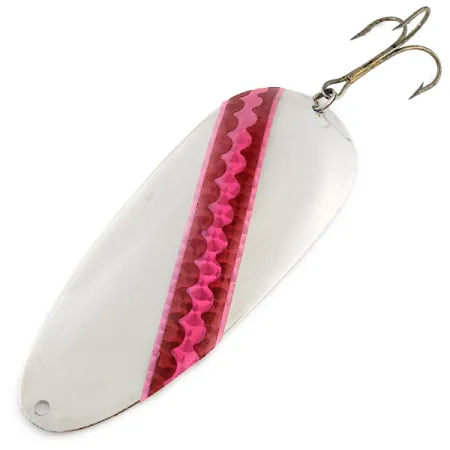 Una caratteristica striscia ondulata rossa e rosa attraversa diagonalmente la superficie in nichel lucido di questo robusto cucchiaino da 58 g (2 oz). Identificato come Dardevle Huskie Junior serie 700 (codice prodotto 23288), il suo corpo robusto da 11,5 cm (4 1/2") è costruito per insidiare grandi predatori attraverso la traina o lo spinning pesante. Il retro dell'esca riporta l'autentica punzonatura di Lou J. Eppinger di Detroit, Michigan, a indicare la sua eredità produttiva americana. Equipaggiato con una grossa ancoretta a gambo spesso, la componentistica è assicurata da un robusto split ring in coda. La finitura in nichel riflettente sul davanti rimane piuttosto nitida, mentre il retro punzonato è brillante e facilmente leggibile. Con una valutazione delle condizioni di 4/5, questo esemplare rappresenta un modello ben conservato della gamma Eppinger più pesante, mantenendo tutta l'integrità strutturale che ci si aspetta da un attrezzo vintage.