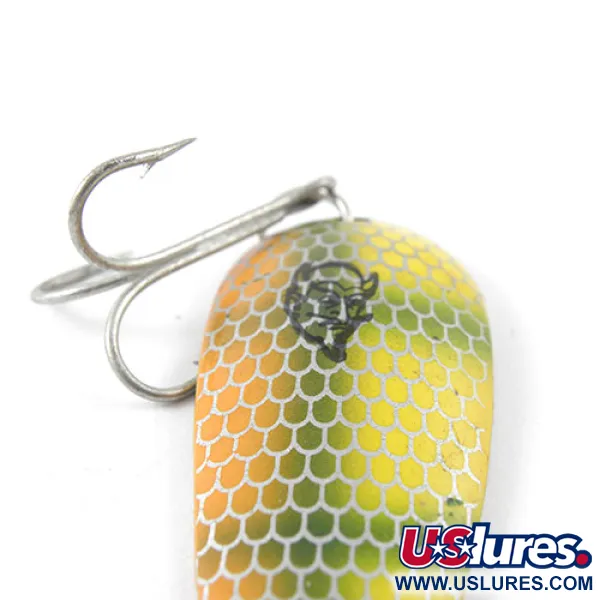Con un peso di 11 g (2/5 oz), questo cucchiaino ondulante è una scelta versatile sia per il lancio che per la traina in varie condizioni d'acqua. L'esterno di questo Dardevle Imp, identificato dal codice prodotto 1183, mostra una vivace tavolozza di colori arancione e giallo, dettagliata con un motivo a nido d'ape argentato e un sottile accento verde vicino alla testa. Sul retro, la superficie concava in argento lucidato presenta la stampigliatura nitida e profonda "DARDEVLE IMP U.S.A.", marchio della tradizione manifatturiera di Eppinger nel Michigan. Con una lunghezza di 5,5 cm (2 1/4"), il profilo a goccia è stampato in metallo ad alto spessore per garantire stabilità durante il recupero. L'armatura consiste in una classica ancoretta argentata fissata da un anellino spaccato alla base. Mantenendo la sua lucentezza originale, questo esemplare ha una valutazione di conservazione di 5/5, riflettendo uno stato eccellente per la collezione.