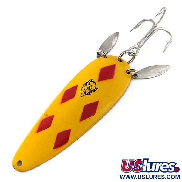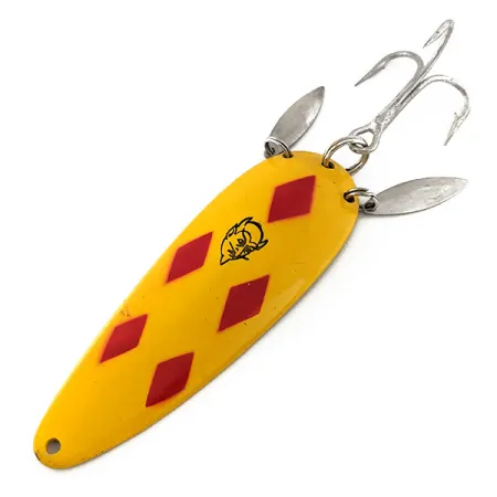 Cinque vivaci rombi rossi su uno sfondo giallo brillante definiscono l'identità visiva di questo modello Eppinger da 9 cm (3 1/2"). Conosciuto come Dardevle Klicker, codice prodotto 11542, questo robusto ondulante da 28 g (1 oz) presenta due piccole lamelle sonore argentate montate vicino all'ancoretta posteriore. Queste lamelle ausiliarie sono progettate per colpire il corpo principale, creando un ticchettio metallico durante il recupero dell'esca. Il lato posteriore con finitura dorata reca lo stampo nitido "DARDEVLE DETROIT, U.S.A.", che evidenzia l'eredità dell'azienda di Lou Eppinger con sede nel Michigan. La componentistica di alta qualità include una grande ancoretta argentata e robusti anellini spaccati in ottime condizioni. Questo esemplare è conservato magnificamente, con una finitura smaltata vibrante e componenti metallici lucidi, meritando una valutazione delle condizioni di 5/5. Il logo nero con la testa di diavolo è centrato tra i rombi, segno inconfondibile di un'autentica creazione vintage Eppinger.