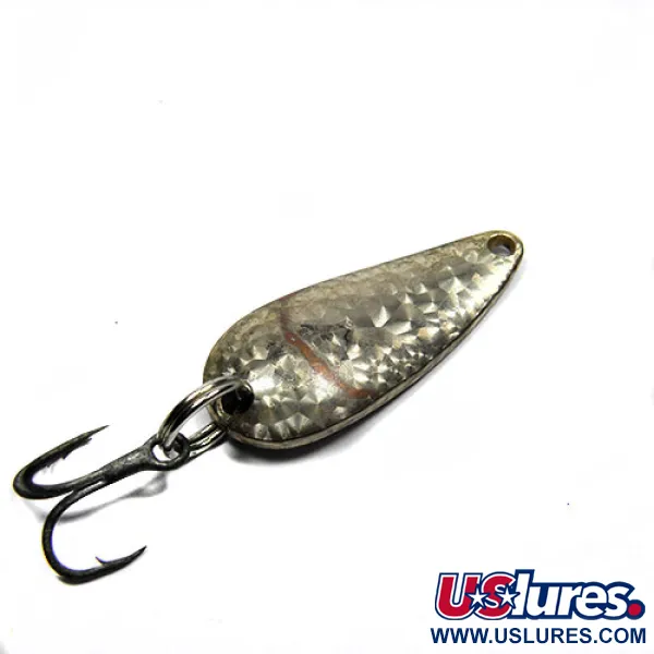 Texture martellate catturano la luce sulla finitura Crystal silver scale di questo cucchiaino da 3 cm (1 1/4"). Questo Eppinger Lildevle, identificato dal codice prodotto 0341, presenta la classica punzonatura Detroit U.S.A. sul retro, un dettaglio che ne attesta l'origine dal laboratorio del Michigan fondato da Lou Eppinger. Con un peso di 3,4 g (1/8 oz), la dotazione consiste in un robusto amo triplo collegato tramite un anellino brisè sicuro. L'esca è in condizioni 4/5, con una placcatura ben conservata e stampigliature pulite. La forma concava del corpo è progettata per un movimento oscillante marcato durante un recupero regolare, rendendolo un elemento essenziale per il lancio sia in acque limpide che velate. La faccia testurizzata è pensata per imitare il bagliore del pesce foraggio, un principio di design che Eppinger utilizza fin dai primi del Novecento.