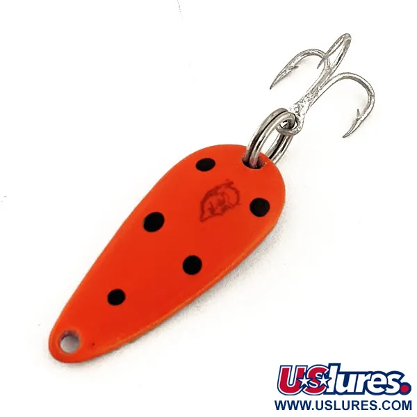 Audaci punti neri contrastano nettamente con la superficie arancio-rossa fluorescente di questo cucchiaino da 3 cm. Stampato con l'iconico logo a testa di diavolo, questo Eppinger Dardevle Lildevle UV riporta il codice 12820. Il retro in nichel fornisce un flash secondario, mentre la vernice specializzata garantisce una luminosità significativa sotto la luce UV: una versione moderna di un'eredità del Michigan che risale ai design originali di Lou Eppinger del 1906. Con un peso di 3,4 g (1/8 oz), offre una densità sufficiente per lanci precisi verso strutture o banchi di pesci. La dotazione include un robusto anello spaccato e un affilato amo triplo argentato, entrambi in condizioni eccellenti con una valutazione di 5/5. Gli stampi proprietari di Eppinger conferiscono a questo ondulante il suo caratteristico profilo concavo, mantenuto con cura fin dal trasferimento dell'azienda a Dearborn nel 1959. Le dimensioni compatte e la finitura ad alta visibilità lo rendono una scelta affidabile per insidiare trote o persici in varie condizioni d'acqua.