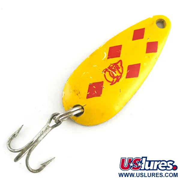 Cinque distinti rombi rossi risaltano sulla finitura gialla brillante di questo ondulante vintage. Questo Dardevle Midget, codice prodotto 4279, misura 3,5 cm e pesa 6 g. Sul lato concavo, l'identità del marchio Eppinger è preservata dalla stampigliatura « DARDEVLE MIDGET U.S.A. » sulla superficie metallica dorata. Il fronte presenta l'iconico logo con la testa di diavolo rosso. Le condizioni sono valutate 5/5, con solo lievi segni di usura superficiale e piccole mancanze di vernice vicino al bordo, comuni per le esche smaltate di quell'epoca. La componentistica include un amo triplo originale di fabbrica fissato da un robusto anellino spaccato. L'eredità di Eppinger a Dearborn, Michigan, affonda le radici in questi design in metallo stampato, famosi per essere stati inclusi nei kit di sopravvivenza dell'aviazione per la loro comprovata efficacia. Il peso lo rende adatto allo spinning leggero per la trota o il persico.