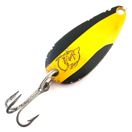 Il marchio 'DARDEVLE MIDGET U.S.A.' stampato sul retro nichelato identifica questo ondulante come un pezzo fondamentale della storia dell'attrezzatura americana. Il lato anteriore presenta un audace motivo diagonale nero e giallo, con l'iconico logo della testa di diavolo chiaramente impresso sulla striscia gialla. Con una misura di 3,5 cm (1 1/2") e un peso di 6 g (3/16 oz), è una dimensione classica per l'attrezzatura leggera, adatta a varie tecniche di lancio. Gli stampi esclusivi di Eppinger conferiscono al cucchiaino la sua caratteristica forma concava, che crea il movimento oscillante distintivo che definisce il marchio fin dai primi giorni di Lou Eppinger a Detroit. La vernice mostra lievi segni di usura e scheggiature lungo i bordi, coerenti con la valutazione di condizione 4/5, mentre l'amo triplo rimane intatto e fissato tramite un robusto anellino spaccato in metallo. I collezionisti che seguono variazioni specifiche riconosceranno il codice prodotto 5429.