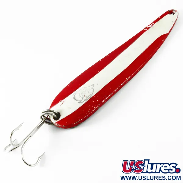 Chiaramente incise sul retro con finitura in nichel, le scritte "SEADEVLET" e "DETROIT - U.S.A." confermano l'origine di questo esemplare dalla leggendaria fabbrica Eppinger. Questo ondulante vintage presenta il classico motivo a strisce bianche e rosse sulla parte anteriore, completo dell'iconico logo con il volto del diavolo posizionato al centro della banda bianca. Lungo 10 cm (4") e con un peso di 40 g (1 1/3 oz), vanta una massa significativa necessaria per raggiungere grandi distanze di lancio. La superficie verniciata mostra segni di utilizzo con piccole scheggiature e usura lungo i bordi, meritando una solida valutazione delle condizioni di 4/5 che ne sottolinea la storia in acqua. Realizzato con stampi proprietari, la caratteristica forma concava è progettata per produrre un movimento oscillante specifico durante il recupero. L'esca è dotata di una robusta ancoretta fissata da un anello spaccato rinforzato, pronta per la cassetta degli attrezzi o per la collezione. Lou Eppinger trasferì la produzione da Detroit a Dearborn nel 1959, datando il marchio "Detroit" su questo pezzo, codice prodotto 3675, a un'epoca precedente della storia centenaria dell'azienda.