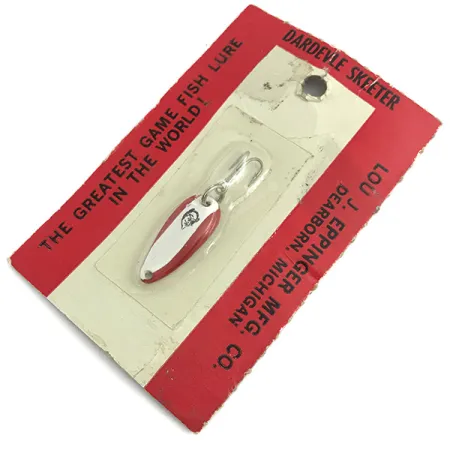 Vivaci strisce smaltate rosse e bianche definiscono il profilo di questo ondulante vintage, impreziosito dall'iconico logo nero con la testa di diavolo. Con una misura ridotta di 2,3 cm (1") e un peso di soli 2 g (1/16 oz), questo Dardevle Skeeter ultra-light è una scelta classica per la pesca alla trota e al persico. Ancora fissato al cartoncino espositivo originale della Lou J. Eppinger Mfg. Co. di Dearborn, Michigan, l'esemplare risale alla produzione successiva al trasferimento del marchio da Detroit nel 1959. Il retro con finitura nichelata fornisce un bagliore metallico a contrasto con la superficie verniciata durante il lancio o lo spinning. Questo pezzo è inutilizzato, conservato nella sua confezione blister originale. Con il codice prodotto 5837, l'esca monta un amo singolo fissato tramite anellino spaccato, ideale per tecniche finesse.