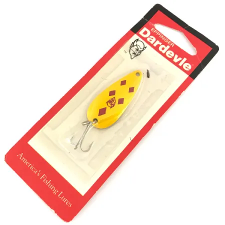 Cinque rombi marroni disposti su uno sfondo giallo contraddistinguono questo Dardevle Spinnie nella storica colorazione "Five of Diamonds". Questo ondulante in metallo, con codice prodotto 7608, pesa 1/4 oz (7 g) e misura 1 3/4" (4,5 cm). Il fronte dell'esca è stampato con il logo della testa di diavolo, marchio di fabbrica dell'azienda e simbolo delle radici del marchio Eppinger nel Michigan. Questo esemplare è inutilizzato e conservato nella sua confezione originale di Dearborn, Michigan, caratterizzata dal classico cartoncino rosso e bianco. L'ancoretta singola è montata in fabbrica e l'etichetta originale rimane sul supporto di cartone, indicando il peso di 7 g (1/4 oz). Questa esca rappresenta i metodi di costruzione tradizionali utilizzati da Eppinger dal 1906 per il design dei suoi ondulanti.