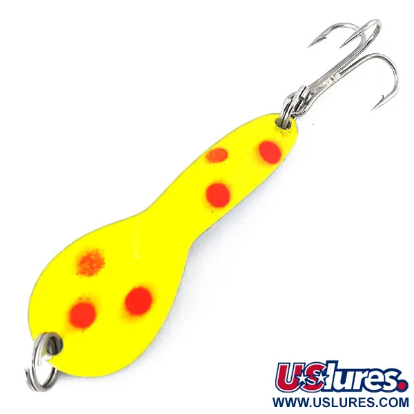 Lungo esattamente 5 cm, questo ondulante presenta un profilo distintivo a paletta rifinito con una base giallo vibrante e cinque punti rosso-arancio. L'Acme Dazzler #2 UV, con codice prodotto 10800, è una rarità fuori produzione in condizioni pari al nuovo. La sua speciale finitura UV si trasforma in un intenso bagliore verde in ambienti con scarsa luminosità, una caratteristica tecnica progettata per attirare i predatori fino a 1 m di profondità. Con un peso di 7 g, l'esca è assemblata con anellini spaccati originali color argento e un'ancoretta affilata, pronta per il lancio o la traina. Questo esemplare prodotto negli USA è un classico esempio delle prime innovazioni di Acme nelle finiture fotoreattive.