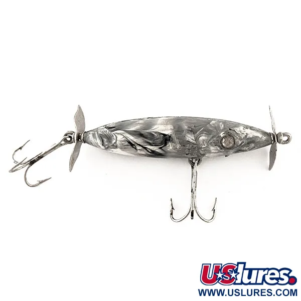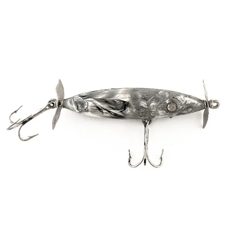 Tonalità grigie e nere marmorizzate caratterizzano la finitura di questo classico americano della metà del secolo. Originario degli Stati Uniti negli anni '50, il Diamond Rattler Jim Strader rappresenta un reperto raro per i collezionisti di esche topwater. Con un peso di 8g (1/4 oz), il corpo affusolato misura 7cm (2 3/4") e presenta un distinto motivo marmorizzato che ricopre l'intero torso. Sia la prua che la coda sono dotate di eliche metalliche progettate per creare turbolenza in superficie durante un recupero regolare. L'armamento include due ancorette — una situata centralmente sulla pancia e un'altra nella parte posteriore — tutte in eccellente stato di conservazione. Un sottile occhio incastonato aggiunge un tocco di realismo alla sezione della testa. Questo esemplare, identificato dal codice prodotto 11552, si mantiene in condizioni impeccabili con una valutazione di 5/5.