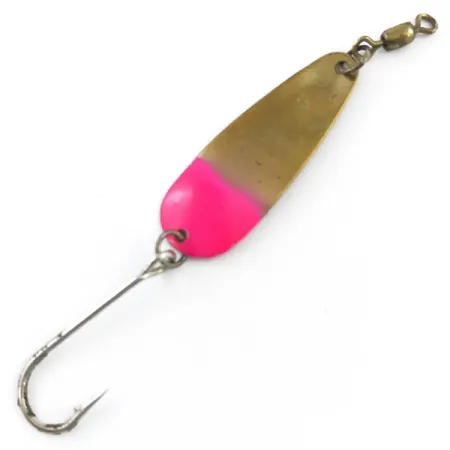 Il peso di 1,7 g (1/16 oz) conferisce a questo Dick Nite #2 il profilo ideale per presentazioni delicate in acque chiare. Lungo 3,5 cm (1 1/2"), l'ondulante presenta una finitura bicolore Oro / Rosso, con la parte rossa caratterizzata da una vivace qualità fluorescente che risalta sulla base metallica. Il nome del marchio è chiaramente stampato sul metallo dorato, identificandone l'origine dalla Dick Nite Spoons negli USA. Questo particolare esemplare, identificato dal codice prodotto 5314, è dotato della sua girella a bariletto originale in ottone e di un amo singolo a gambo lungo. Con una valutazione delle condizioni di 4/5, l'esca mostra una superficie pulita e componenti ben mantenuti. Il sottile spessore del metallo utilizzato nella sua costruzione riflette le tecniche di produzione tradizionali utilizzate per questi artificiali, progettati specificamente per un uso efficace nella traina a basse velocità.