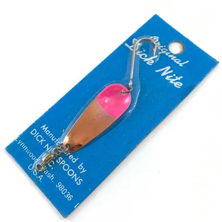 Il metallo ramato incontra una punta rosa vibrante in questo ondulante vintage, una combinazione di colori spesso preferita per la sua visibilità in varie condizioni d'acqua. Con un peso delicato di 1/16 oz (1,7 g), il Dick Nite #2 misura esattamente 1 1/2" (3,5 cm) di lunghezza. Prodotto con il codice prodotto 5316, questo esemplare è in condizioni non utilizzate, ancora fissato al suo cartoncino blu originale "Original Dick Nite". La confezione conferma la sua eredità, prodotto da Dick Nite Spoons Inc. a Lynnwood, Washington, U.S.A. L'esca è dotata di una girella integrata color ottone in testa per il fissaggio della lenza e di un affilato amo singolo nella parte posteriore. La finitura in rame rimane lucida e riflettente, contrastando con la vernice rosa che copre il terzo superiore del corpo metallico. Questo modello specifico rappresenta un'epoca classica del design di attrezzatura del Pacific Northwest, enfatizzando componenti funzionali e artigianato americano schietto.