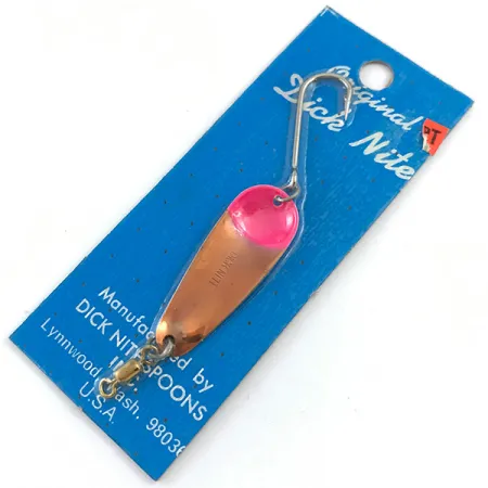 Una punta rosa vivace verniciata sul corpo in rame lucidato caratterizza questo ondulante vintage Dick Nite #2, ancora fissato alla sua scheda originale blu di fabbrica. Con un peso di 1,7 g (1/16 oz), questo ondulante dal profilo ridotto rappresenta l'eredità della produzione di attrezzatura del Nord-Ovest da Lynnwood, Washington. Il corpo metallico da 3,5 cm (1 1/2") è chiaramente stampato con il nome del produttore e presenta una girella color ottone in testa. Identificato dal codice prodotto 5318, questo esemplare è in condizioni pari al nuovo, mostrando una finitura pulita senza segni di usura. L'amo argentato è tenuto in posizione dall'involucro di plastica della scheda, preservando l'assemblaggio originale così come è uscito dal laboratorio. La valutazione delle condizioni è 6, poiché l'esca è inutilizzata e presentata nella sua confezione vintage originale.