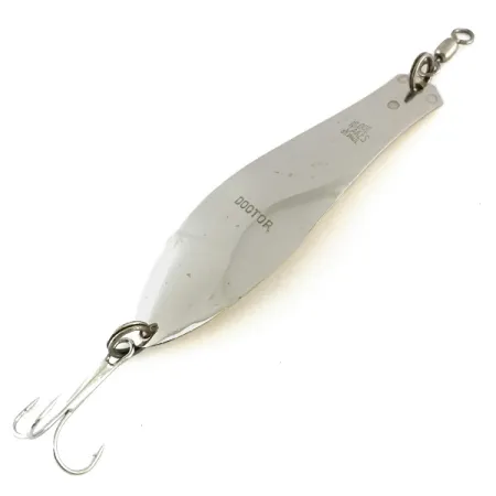 Stampato nel metallo con il marchio "DOCTOR" e l'origine "USA", questo ondulante da 9,5 cm mette in mostra una finitura bicolore ad alto contrasto. Un lato presenta una nichelatura riflettente, mentre il retro è rifinito in oro lucido, fornendo diversi profili di bagliore a seconda dell'angolo di luce. Con un peso di 17 g, la solida struttura metallica lo rende una scelta sostanziale sia per il lancio che per la traina. La componentistica comprende una girella a barilotto in testa per gestire la torsione della lenza e un robusto amo triplo fissato tramite un anellino spaccato nella parte posteriore. Per quanto riguarda le condizioni, rimane in uno stato eccellente 5/5, con le superfici che mantengono la loro lucentezza originale e le stampigliature che restano nitide e leggibili. Questo modello specifico, identificato dal codice prodotto 8515, rappresenta un design classico utilizzato da generazioni di pescatori per insidiare i grandi predatori d'acqua dolce.