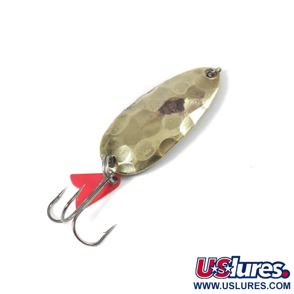 Martellata a mano in ottone di alta qualità, la superficie martellata di questo ondulante di produzione svizzera mette in mostra le tecniche di produzione artigianale che un tempo erano lo standard per il marchio EGB. Con una misura di 4,5 cm (1 3/4") e un peso di 9,5 g (1/3 oz), l'esca presenta una finitura in ottone con singoli segni di martellatura che creano una superficie riflettente sfaccettata. Il retro è chiaramente stampigliato con il marchio "EGB SWISS MADE", che ne identifica l'origine e la qualità per i collezionisti esperti. Questa specifica esca, codice prodotto 2100, è dotata di un'ancoretta affilata e della classica pinnetta attrattrice in plastica rossa fissata tramite l'anello spaccato posteriore. Le sue condizioni sono valutate con un solido 4/5, mostrando leggeri segni superficiali pur rimanendo pulita e ben conservata. Ogni colpo di martello dell'artigiano utilizzato per modellare questo corpo in ottone ha assicurato che non esistessero due esche esattamente uguali.