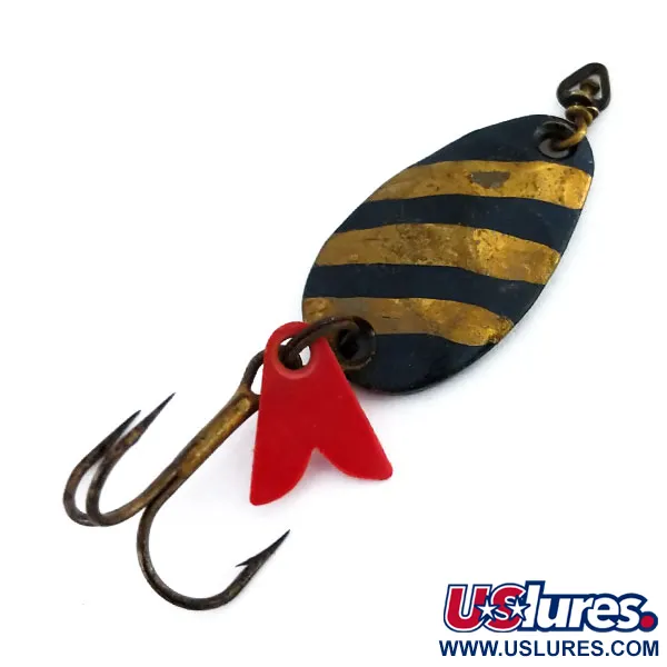 Una struttura in ottone costituisce la base di questo autentico ondulante EGB Swiss-made, lungo 2,5 cm (1"). Un lato del metallo presenta un motivo accattivante a strisce alternate nere e oro, mentre il retro mostra l'autentico marchio "EGB SWISS MADE" chiaramente impresso nella superficie testurizzata. Con un peso delicato di 3 g (3/32 oz), l'esemplare è armato con la sua ancoretta originale e un caratteristico trailer a paletta in plastica rossa fissato all'anellino spaccato posteriore. Questi artificiali erano storicamente noti per i loro materiali di alta qualità, con ogni pezzo martellato a mano per creare le specifiche rientranze superficiali visibili sull'ottone. Identificato dal codice prodotto 9753, l'artificiale mantiene un aspetto pulito con minuteria ben conservata, meritando una valutazione di condizione 4/5. L'assemblaggio superiore del filo include un piccolo occhiello girevole, tipico della produzione di precisione tipica dei negozi di articoli da pesca svizzeri di quell'epoca.