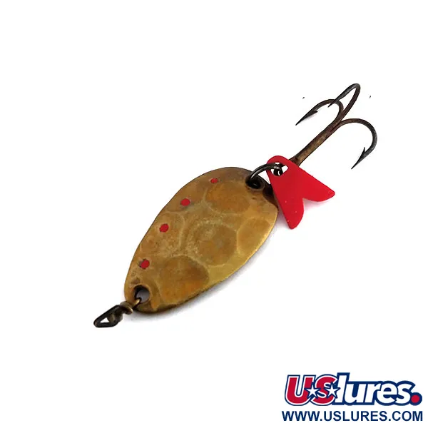 Le fossette martellate a mano catturano la luce sul corpo in ottone di questo ondulante svizzero da 3 cm (1 1/4"). Con un peso di 4 g (1/8 oz), l'esca è caratterizzata da quattro distinti punti rossi lungo un bordo, un classico elemento di design EGB tipico delle attrezzature leggere. Sul retro, il marchio "EGB SWISS MADE" rimane nitido e leggibile, a indicare la lavorazione manuale. L'armatura include un amo tripletta bronzato abbinato a un trailer in plastica rossa a forma di cuore. Con il codice 9857, questo esemplare è in condizioni eccellenti 5/5, con una finitura lucida e pulita su entrambi i lati.