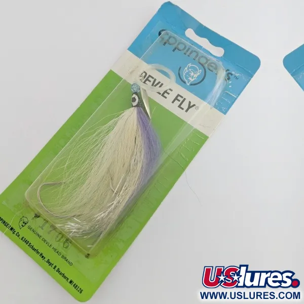 Il pelo di cervo (bucktail) viola e bianco costituisce il profilo visivo principale di questo assetto da traina specializzato, un design che unisce un cucchiaino tradizionale a una mosca. Prodotto dalla Lou J. Eppinger Mfg. Co. di Dearborn, Michigan, il Devle Fly utilizza una lama metallica rotante su un asse per generare lampi di luce durante il recupero. Questo esemplare, identificato dal codice prodotto 24438, presenta una lama con finitura al nichel abbinata a un amo dressato bianco e viola. È progettato per applicazioni di traina in acque profonde, spesso utilizzato in combinazione con un flasher o un attrattore per la cattura di trote di lago e altri salmonidi. Conservato nella sua confezione originale in cartoncino verde e blu, questo artificiale non è mai stato usato (condizione 6). L'assemblaggio include un amo singolo integrato nel bucktail per mantenere un profilo idrodinamico. Un dettaglio con occhio dipinto sulla parte in piombo della mosca offre un punto di attacco specifico situato dietro la lama rotante in nichel.