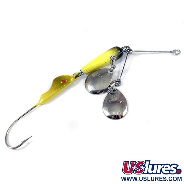 Sulle palette in nichel è chiaramente stampato il marchio "DEARIE TWIN", che identifica questa come una variante specializzata del leggendario spinner weight-forward. Una testa in piombo giallo brillante, rifinita con una spruzzata verde oliva scuro sul muso, fornisce il peso di 1/2 oz (14 g) necessario per la pesca a traina e il lancio in acque profonde. Questo modello specifico, codice prodotto 2005, utilizza un'armatura in metallo per alloggiare due palette in nichel lucido invece della singola tradizionale, aumentando il profilo visivo. La vernice rimane vibrante e i componenti in nichel sono riflettenti, garantendo una valutazione delle condizioni di 5/5. Progettata per le sfide della pesca al walleye nei Grandi Laghi, l'esca presenta un amo singolo heavy-duty integrato direttamente dietro il corpo zavorrato. Le scritte stampate su entrambe le palette sono nitide e leggibili, riflettendo il controllo qualità delle sue radici manifatturiere americane.
