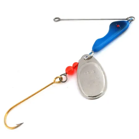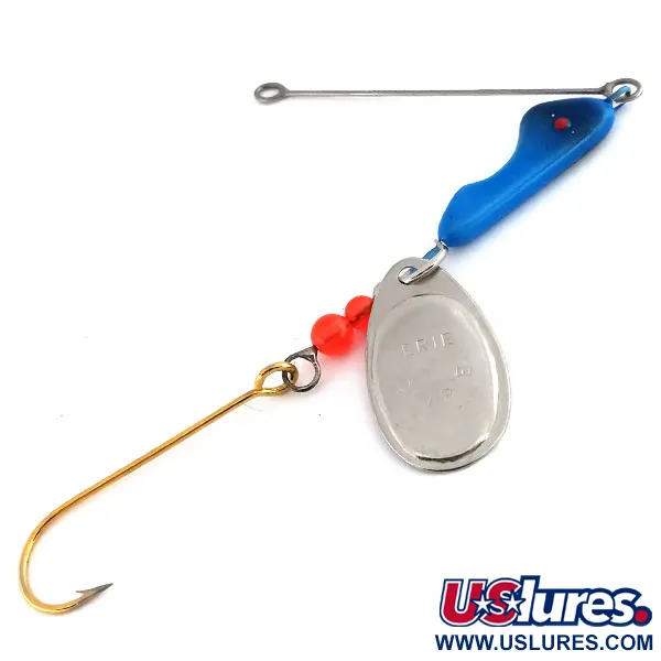 Con un peso di 12g, questo spinnerbait presenta una caratteristica testa piombata rifinita in blu profondo con un singolo punto oculare rosso. La paletta nichelata è punzonata con il nome ERIE, simbolo della tradizione del marchio Erie Dearie negli USA. Due vivaci perline rosse sono posizionate sull'armatura in metallo, terminando con un affilato amo a gambo lungo con finitura dorata. Questo modello, identificato dal codice prodotto 9929, ha una valutazione di 5/5, senza segni di utilizzo o usura da stoccaggio sulla vernice blu o sulle superfici metalliche. Sviluppato originariamente per la pesca a traina su scogliere e fondali rocciosi, la costruzione punta sulla robustezza e sull'elevata visibilità in diverse condizioni d'acqua.