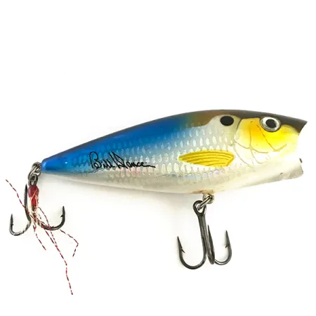 La firma del leggendario pescatore Bill Dance è riportata sul fianco dalle sfumature blu di questo artificiale topwater. Lungo 8 cm (3 1/4"), l'esca sfrutta una bocca concava per spostare l'acqua in superficie (0 m). Un peso di 12,5 g (2/5 oz) garantisce stabilità per lanci a lunga distanza verso le strutture. Nella colorazione Threadfin Shad, una finitura olografica riflette la luce attraverso i fianchi argentati con motivo a scaglie, mentre la gola gialla aggiunge un contrasto sottile. Sul ventre bianco, il codice 6482 è associato al marchio "Excalibur POP'N IMAGE" chiaramente stampato. L'amo triplo posteriore presenta piume di hackle rosse e bianche, pensate per scatenare l'attacco quando l'esca è ferma. Questo esemplare mantiene un elevato livello di conservazione con una valutazione dello stato di 5/5.