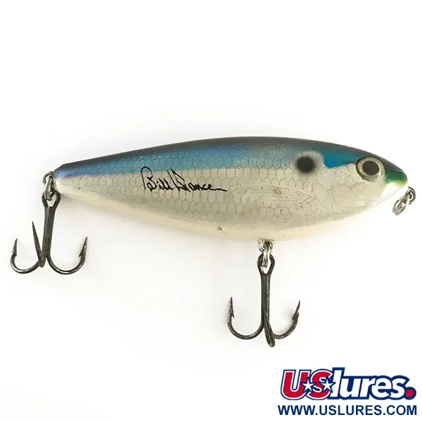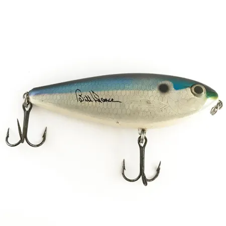 Una trama di squame dettagliata percorre il corpo da 8 cm di questo classico artificiale topwater, caratterizzato da un dorso blu intenso che sfuma verso fianchi bianco-argento. La firma di Bill Dance è ben visibile accanto a un distintivo punto nero, identificando questo pezzo come parte di una serie signature. Con un peso di 13 g, l'esca riporta il codice prodotto 6520 ed è armata con due robusti ami tripli dalla finitura scura. Prodotta da Heddon nella linea Excalibur, la struttura include un meccanismo rattle interno per una maggiore presenza sonora. Sebbene sia utilizzata principalmente per tecniche di superficie, è progettata per profondità fino a 0,5 m. Il grado di conservazione 5/5 è evidente nella nitidezza del marchio "Excalibur SPIT'N IMAGE" sulla spalla e nella finitura pulita del corpo. Un occhio grande e realistico con iride dorata funge da punto focale vicino all'occhiello frontale.