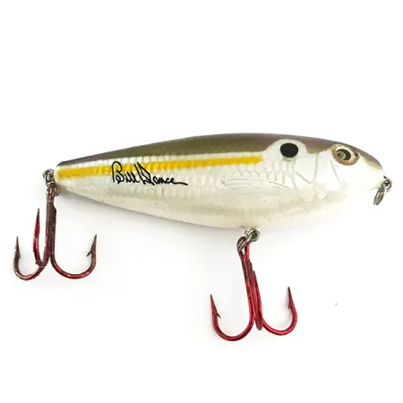 Le ancorette rosse risaltano sulla livrea a scaglie argentee di questo Heddon Excalibur Spit'n Image, che riporta la firma di Bill Dance sul fianco. Catalogata con il codice prodotto 6619, questa imitazione di shad topwater pesa 10g (1/3oz) e misura 7,5cm (3") di lunghezza. La finitura Viola / Oro è caratterizzata da una delicata tonalità violetta sulla testa e da una linea laterale giallo brillante che accentua i fianchi. Questo esemplare prodotto negli USA è progettato come esca rumorosa, ideale per lavorare nella parte superiore della colonna d'acqua fino a una profondità di 0,5 m (1,6ft). Le condizioni fisiche sono eccellenti, con una finitura ben conservata e ami affilati che meritano un punteggio di 5/5. Un occhio dettagliato con pupilla nera e anello dorato ne aumenta l'aspetto realistico, completato da un anello spaccato montato in fabbrica sull'occhiello di fissaggio.