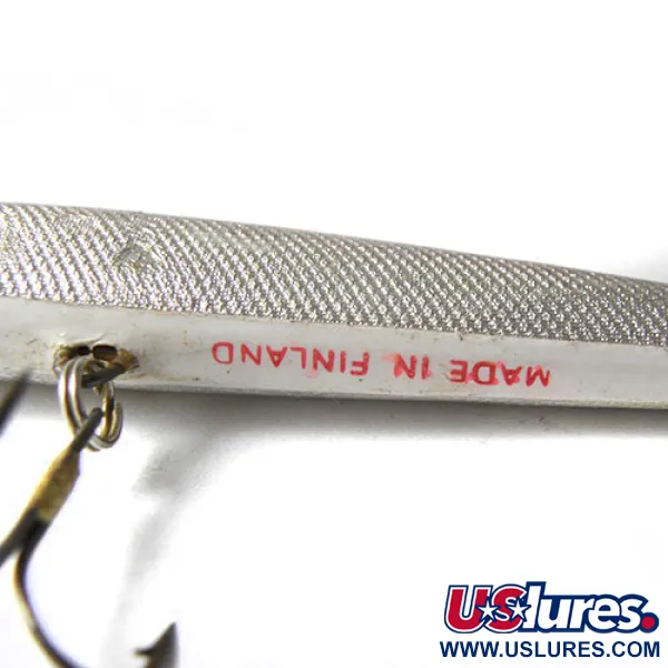 Una texture a scaglie naturali ricopre l'intera lunghezza di questo minnow da 12 cm (4 3/4"), riflettendo la luce proprio come un vero pesce esca. La pancia presenta il distintivo marchio "MADE IN FINLAND" impresso in inchiostro rosso, un chiaro segno dell'artigianalità di Finlandia Uistin. Questo esemplare, identificato dal codice prodotto 0216, utilizza un dorso color antracite scuro che contrasta nettamente con i fianchi argentati e un piccolo accento rosso sulla bocca. Con un peso di 6 g (3/16 oz), l'esca è dotata di una paletta trasparente per nuoto a bassa profondità, adatta al casting o alla traina negli strati superficiali dell'acqua. La componentistica è in ottime condizioni, con le ancorette originali che contribuiscono a una valutazione dello stato di 4/5. Il suo profilo sottile e l'autentica costruzione finlandese la rendono un'aggiunta degna di nota a una collezione di esche europee regionali.