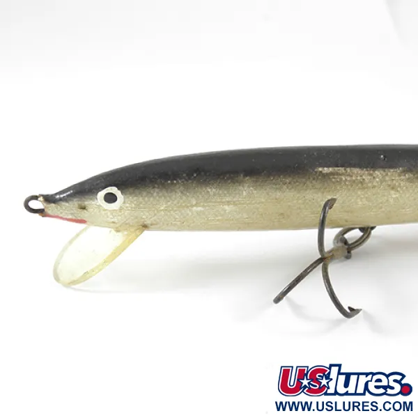 Lungo 15 cm (6"), questo minnow in legno proveniente dalla Finlandia incarna i primi principi di design della metà degli anni '60. Prodotto da Finlandia Uistin tra il 1963 e il 1965, il corpo presenta una livrea naturale con dorso scuro che sfuma in scaglie oro-argento sui fianchi. Significativi per la sua storia sono i segni di denti visibili lungo i lati, prova della sua efficacia in acqua e motivo della valutazione 3/5 dello stato di conservazione. Con un peso di 8 g (1/4 oz), il profilo sottile è armato con due ancorette e una paletta trasparente, catalogato con il codice prodotto 1302. La sua struttura riflette il passaggio dalle esche artigianali alla produzione più standardizzata della regione nordica in quel periodo.