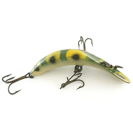 Una vistosa livrea Rana decora il corpo ricurvo di questo esemplare vintage, con vivaci segmenti gialli e macchie circolari scure su uno sfondo verde intenso. L'esca è dotata di una specifica disposizione della minuteria, che comprende due ancorette montate sulla pancia e una terza sulla coda, tutte assicurate con i caratteristici fissaggi a filo avvolto. Lungo 7 cm (2 3/4") e pesante 5 g (3/16 oz), questa taglia X5 è un classico esempio del design iconico di Charles Helin. Prodotto da Helin Tackle e identificato dal codice 6662, la fattura riflette la qualità del produttore di Detroit. La finitura lucida rimane vibrante su tutta la superficie, garantendo a questo modello una valutazione di 5/5. Progettato per lo spinning o la traina lenta, l'occhiello sfalsato sulla testa piatta e larga è un segno distintivo della geometria unica della famiglia FlatFish.