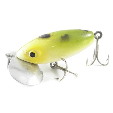 Sull'ampia paletta metallica è chiaramente stampata l'origine di questo classico Atlantic Lures: Providence, Rhode Island. Questo Frantic Antic, identificato dal codice 1575, sfoggia una vivace livrea Frog con pancia giallo pallido e dorso verde a macchie scure circolari. Con un peso di 6 g (3/16 oz) e una lunghezza di 5 cm (2"), l'esca è un popper di superficie che sfrutta la sua larga piastra frontale per il movimento in acqua. La dotazione include due ancorette e un occhiello superiore per l'attacco della lenza. Le condizioni sono valutate 4/5, con la superficie verniciata liscia e le parti metalliche che mostrano minimi segni del tempo. La grande paletta in metallo è fissata saldamente con due viti a filo, mantenendo il marchio Atlantic Lures in primo piano.