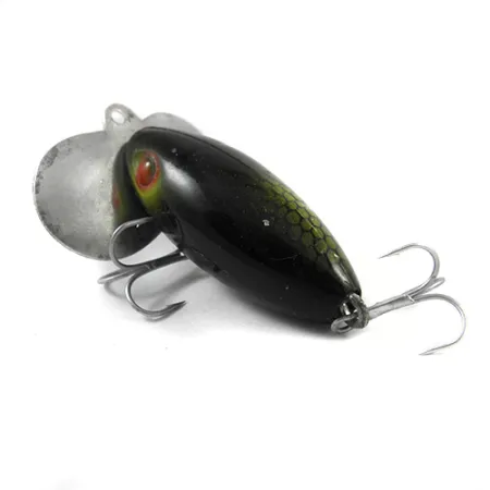 Con una lunghezza di esattamente 2 pollici (5 cm), la piastra metallica frontale di questo esemplare Atlantic Lures riporta chiaramente il nome del modello e la sua origine da Providence, R.I. L'esca da 3/16 oz (6 g) presenta un corpo nero ornato da un motivo a nido d'ape chartreuse sui lati e occhi audaci con centro rosso. Identificato dal codice prodotto 2750, il Frantic Antic è un plug di superficie progettato con una grande lama d'argento che genera rumori ritmici udibili mentre si muove in superficie. L'armo è composto da due ancorette originali, una situata sulla pancia e l'altra che pende dall'occhiello posteriore. Valutata in condizioni 4/5, l'esca mostra una leggera usura sulle parti metalliche argentate, mentre la finitura verniciata rimane vibrante su tutto il profilo.