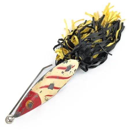 Lungo 6 cm (2 1/4"), il corpo di questo ondulante presenta una testa rossa che sfuma in una sezione centrale color crema, impreziosita da strisce orizzontali rosse. Sul lato inferiore in metallo sono incisi profondamente il nome Fred Arbogast e la dicitura Hawaiian, a conferma delle sue origini made in USA. Questo Fred Arbogast #3 Hawaiian porta il codice prodotto 23276 e pesa ben 16 g (3/5 oz), risultando ideale per tecniche di lancio mirate. L'esemplare è in condizioni 4/5, con lievi mancanze di vernice sul corpo e sulla testa che testimoniano la sua età senza compromettere l'estetica generale. Un folto skirt bicolore in filamenti di gomma neri e gialli è fissato nella parte posteriore, vicino all'amo singolo. Un antialga metallico rigido si estende dall'occhiello di legatura fino alla punta dell'amo per prevenire incagli tra la vegetazione sommersa. La parte rossa della testa è rifinita con il dettaglio di un occhio dipinto in modo semplice.