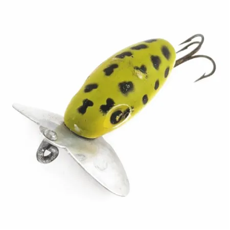 L'iconica paletta in metallo, chiaramente stampata con "Jitterbug" e "Fred Arbogast, Akron, Ohio", definisce la silhouette classica di questo crawler di superficie da 1 1/2" (4 cm). Caratterizzato dalla finitura Green Frog, il corpo presenta una vivace base giallo-verde accentuata da audaci macchie nere e una pulita parte inferiore color crema. Con un peso di 1/8 oz (4 g), questa dimensione compatta è stata progettata specificamente per applicazioni con attrezzatura leggera e approcci finesse topwater. Due viti fissano saldamente l'ampia paletta in alluminio a forma di cuore al muso, creando il ritmico suono di nuoto quando recuperato sulla superficie dell'acqua. L'hardware è montato con un singolo amo tripletta posteriore, rimanendo fedele alla configurazione originale per questo telaio più piccolo. Trovato in rispettabili condizioni 4/5, la vernice rimane in gran parte intatta con solo lievi segni del tempo coerenti con il suo stile vintage. Articolo di riferimento #24568 per questa variante Green Frog.