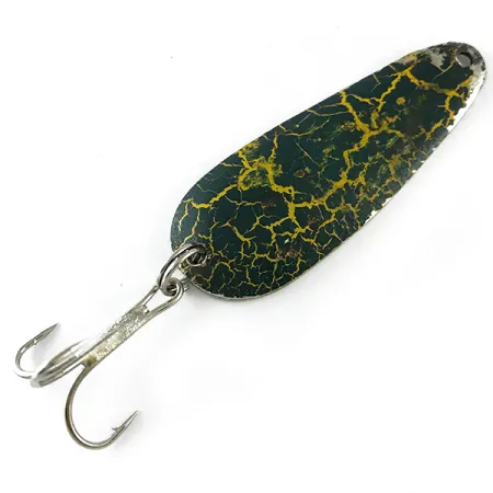Un caratteristico motivo a rana con finitura craquelé e riflessi gialli su una base verde scuro definisce la parte anteriore di questo ondulante da 9 g (1/3 oz). Con una lunghezza di 5,5 cm (2 1/4"), il corpo metallico presenta un lato posteriore in nichel lucidato dove il nome "GADABOUT GADDIS" è chiaramente punzonato nel metallo. Identificato con il codice 6246, questo esemplare è un classico rappresentante dell'attrezzatura da pesca americana di metà secolo associata al leggendario "Flying Fisherman". L'esca è armata con un anellino spaccato argentato e un robusto amo triplo. Nel suo stato attuale 4/5, l'esca mostra leggeri segni superficiali sulla finitura verniciata, sebbene il nichel rimanga lucido e la stampigliatura sia ben nitida. Questo modello è stato progettato per lo spinning in acque dolci, dove il contrasto tra il dorso scuro e il fondo riflettente risulta più efficace.