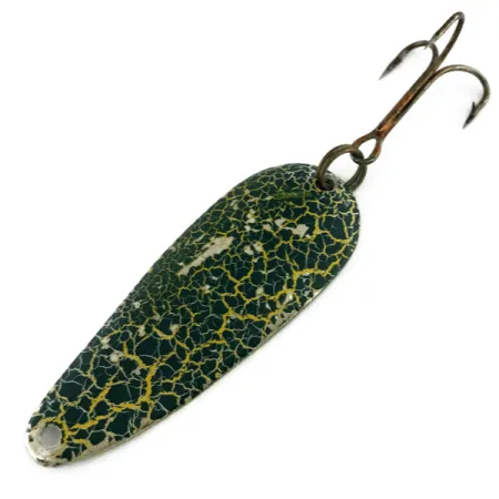 Sulla parte inferiore in nichel lucidato di questo ondulante da 5,5 cm (2 1/4") è impresso il nome leggendario "GADABOUT GADDIS", in onore del famoso "Flying Fisherman" della metà del secolo scorso. Con un peso di 9 g (1/3 oz), l'esca presenta sul lato convesso una classica finitura Frog, con una base verde scuro e una trama craquelé giallo-oro. Questo esemplare, catalogato con il codice prodotto 9482, rappresenta un'epoca distintiva dell'attrezzatura da pesca prodotta negli USA. L'hardware originale include un anellino spaccato ad alta resistenza e un'ancoretta affilata con finitura bronzata. Le condizioni sono valutate 4/5, mostrando solo un leggero invecchiamento superficiale che ne riflette la storia senza compromettere l'integrità della vernice o del metallo. Questi cucchiaini sono stati resi celebri da Roscoe "Gadabout" Gaddis durante la sua carriera televisiva, progettati come strumenti versatili per il lancio o la traina. La nichelatura fornisce un lampo luminoso sotto la vernice testurizzata, un dettaglio costruttivo studiato per creare contrasto visivo in acqua.