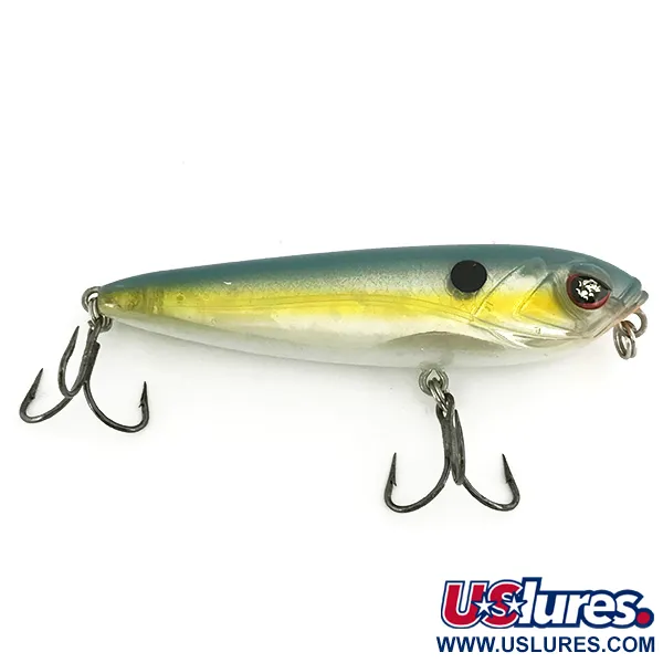 Un'evidente macchia laterale nera segna il fianco di questo walker da 10g (1/3oz), fornendo un bersaglio chiaro per gli attacchi in superficie. Questo Gary Yamamoto Tate' Pencil, identificato dal codice prodotto 6960, sfoggia una combinazione di colori sfumati che inizia con un dorso verde acqua profondo, passa a una banda giallo acceso e termina con il ventre bianco perla. Lungo 8cm (3 1/4"), l'artificiale è dotato di realistici occhi rossi 3D e placche branchiali finemente strutturate stampate nella testa. Questa esca galleggiante di superficie prodotta negli Stati Uniti è adatta sia al lancio che alla traina per insidiare specie come salmone, luccio e perca. L'hardware include due robusti ami tripli collegati tramite anellini spaccati resistenti. In condizioni 5/5, la finitura rimane nitida e vibrante su tutto il corpo.
