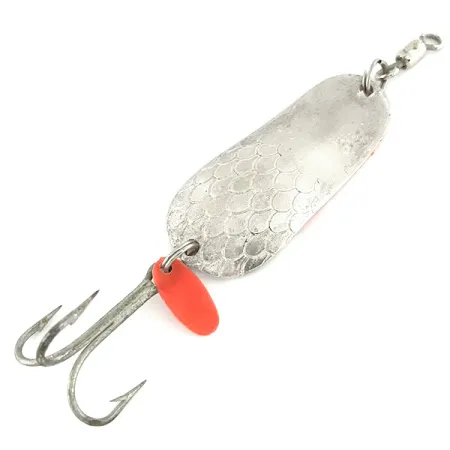 Realizzato in Canada, questo ondulante da 25g (1oz) presenta un caratteristico motivo a scaglie martellate sulla sua faccia argentata. Lungo 6 cm (2 1/4"), il Gibbs Delta Kit-A-Mat #55, identificato dal codice 7086, abbina la sua lucentezza metallica a un lato posteriore arancione fluorescente che emette una vivace luminosità sotto la luce UV. Questa configurazione cromatica è progettata specificamente per la visibilità in acque profonde o torbide. La componentistica è robusta, con un solido amo triplo arricchito da una piccola pinna attrattrice in plastica rossa vicino allo split ring; viene fornito già montato con una girella barrel per prevenire la torsione del filo durante il lancio o la traina. Il marchio del produttore è chiaramente visibile sul lato fluorescente, a conferma del numero di modello. Questo esemplare è in condizioni 4/5, con superfici ben conservate e minuteria pulita. Il suo profilo pesante rispetto alla lunghezza permette lanci lunghi anche in presenza di vento.