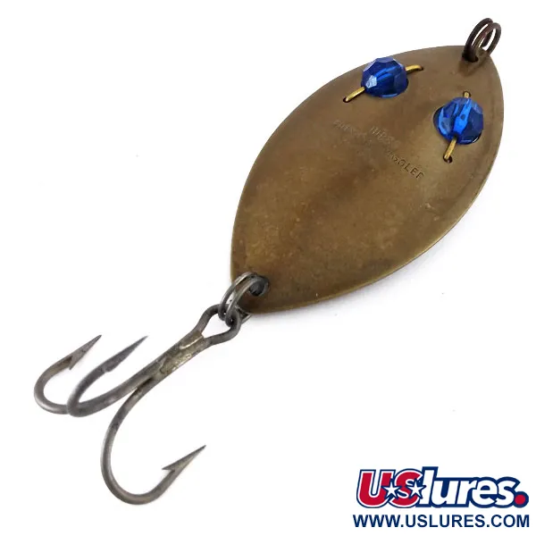 Con una lunghezza di 9 cm (3 1/2"), il profilo ampio di questo ondulante a goccia è caratteristico della lavorazione dei metalli americana della metà del secolo. Questo specifico Gibbs One Eye Wiggler, spesso citato come variante Ruby Eye nei cataloghi storici, è stato prodotto negli USA prima del 1970. Il corpo in ottone bronzato fornisce un riflesso naturale e attenuato, completato da due distintive perle blu sfaccettate fissate con punti metallici. Queste perle fungono da "occhi" dell'esca, progettate per catturare la luce in modo diverso dalle finiture verniciate standard. Con un peso di 35 g (1 1/4 oz), è una scelta formidabile per lo spinning o la traina in profondità. La superficie metallica rimane pulita e ben conservata, a dimostrazione della qualità della manifattura originale. Un'ancoretta robusta è collegata tramite un anello spaccato per carichi pesanti, pronta per l'uso in acque dolci impegnative o in ambito costiero salato. Con il codice prodotto 10169, questo esemplare è in eccezionali condizioni 5/5, un reperto ben conservato della storia della pesca d'epoca.