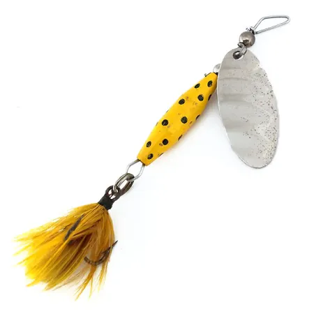 Le finiture in nickel martellato come quella su questa paletta offrono una trama visiva distinta che contraddistingue i primi artificiali Glen Evans. Chiaramente stampata con la dicitura "SHYSTER 1/4 OZ CALDWELL IDAHO", la paletta metallica mostra le origini autentiche di questo classico cucchiaino rotante prima che il design venisse successivamente concesso in licenza a Luhr Jensen. Con un peso di 1/4 oz (7 g) e una lunghezza totale di 2 3/4" (7 cm), questo esemplare presenta l'iconico corpo giallo decorato con audaci punti neri. Un dressing di piume gialle coordinate copre l'amo triple, mantenendo il vivace profilo cromatico fino alla coda. Progettato originariamente per prestazioni sia in acque ferme che in correnti costanti, questo Glen Evans Shyster (codice prodotto 11020) è altamente efficace durante i recuperi lenti. La ferramenta rimane lucida e la vernice è eccezionalmente ben conservata, conferendo a questo artificiale una valutazione di condizione 5/5. Ogni componente, dalla staffa all'occhiello metallico, rimane saldo e funzionale.