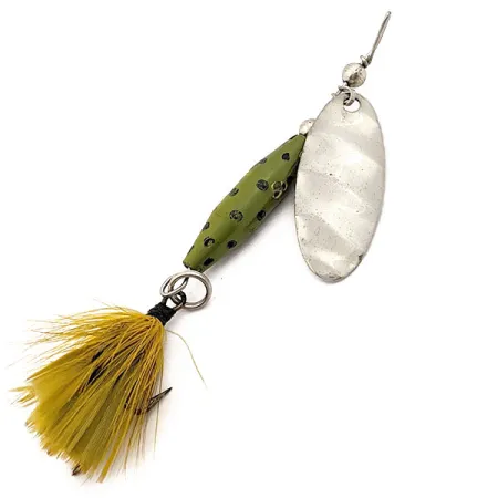 Un classico cucchiaino rotante con finitura nichelata, punzonato con il marchio Glen L. Evans Caldwell, Idaho, caratterizza questo pezzo storico per lo spinning di metà secolo. Con un peso di 1/4 oz (7 g), il Glen Evans Shyster presenta un corpo affusolato verde decorato con puntini neri applicati a mano lungo la sua struttura di 2 3/4" (7 cm). L'armatura è composta da un'ancoretta con piume gialle fissata tramite un robusto split ring, una soluzione costruttiva spesso preferita per insidiare trote e altri piccoli predatori in diverse condizioni d'acqua. Identificato dal codice prodotto 17901, questo esemplare testimonia l'artigianalità del produttore dell'Idaho. Lo stato di conservazione è valutato 5/5, poiché la vernice verde rimane brillante e la palletta in nichel mostra un'usura minima, preservando la leggibilità del marchio impresso. Questo specifico modello utilizza un corpo zavorrato per aumentare la distanza di lancio senza l'impiego di pesi aggiuntivi.