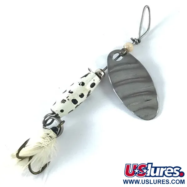 Un corpo bianco distinto, decorato con audaci punti neri, identifica questo classico cucchiaino rotante, un design originariamente introdotto dalla Glen Evans. Con un peso di 1/8 oz (4 g) e una lunghezza totale di 2 1/4" (6 cm), lo Shyster presenta un caratteristico occhiello disassato progettato per ridurre la torsione del filo. Questo esemplare, con codice prodotto 3661, monta una pala argentata con la tipica zigrinatura orizzontale, un classico della produzione di attrezzatura americana d'epoca. L'ancoretta posteriore è guarnita con piume bianche, conferendo un profilo visivo più naturale alla coda. Realizzato negli USA, mantiene una struttura robusta e il grado di conservazione 5/5 indica un pezzo perfettamente preservato con finiture pulite su ogni componente. A differenza di molti rotanti in linea standard, questa configurazione è nota tra i collezionisti per la sua capacità di lavorare efficacemente a basse velocità di recupero, sia in corrente che in acque ferme.