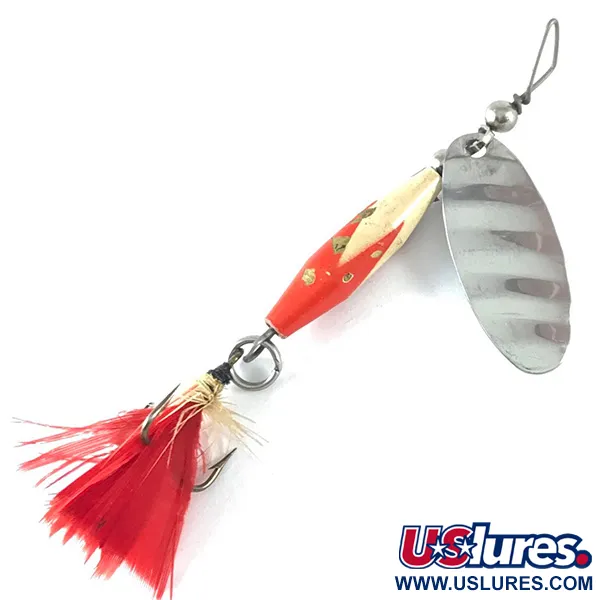 Un vivace corpo in piombo verniciato in rosso e bianco definisce l'aspetto estetico di questo Glen Evans Shyster da 7g (1/4oz). Identificato con il codice prodotto 3666, questo cucchiaino rotante vintage da 7cm (2 3/4") presenta il classico attacco sfalsato caratteristico della produzione originale Glen Evans, prima che il design venisse successivamente prodotto da aziende come Luhr Jensen. La pala in nickel è chiaramente stampata con il nome del marchio Shyster, abbinata a un amo triplo guarnito con piume rosso brillante. Il design del corpo zavorrato è costruito per lanci efficaci a varie profondità sia in corrente che in acque ferme, specificamente indicato per un recupero lento. Prodotto negli USA, l'esca è in condizioni eccellenti con una valutazione di 5/5, mostrando vernice pulita e componenti metallici lucidi. L'ancoretta piumata mantiene il suo profilo pieno, offrendo un netto contrasto con la pala in nickel lucidato.