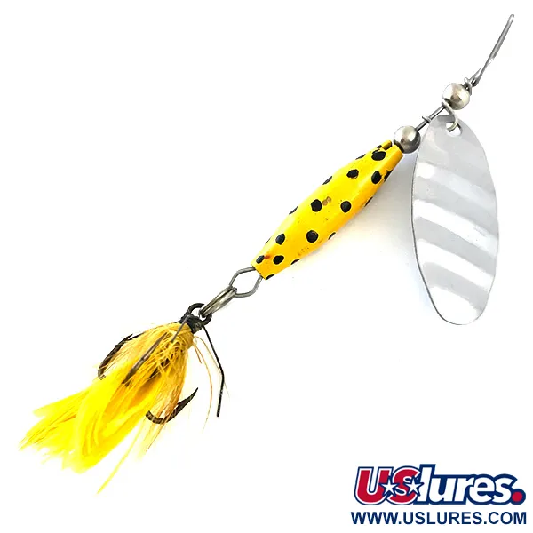 Caratterizzato dal corpo giallo vibrante con evidenti punti neri, questo cucchiaino rotante rappresenta un pezzo di storia della pesca americana del produttore originale Glen Evans. Con un peso di 1/4 oz (7 g) e una lunghezza totale di 2 3/4" (7 cm), l'esemplare presenta una paletta in nichel lucido stampata con il nome "Shyster" e il marchio Glen Evans. Questo articolo, identificato dal codice 5382, è conservato in condizioni 5/5 con vernice pulita e parti metalliche brillanti. Glen Evans ha introdotto questo design negli USA prima che diventasse un classico prodotto da altri celebri marchi come Luhr Jensen. La struttura include un corpo zavorrato affusolato e un'ancoretta con piume gialle, una combinazione storicamente utilizzata per recuperi lenti sia in acque ferme che in corrente. Le piume di hackle gialle sono folte e fissate saldamente all'ancoretta posteriore.