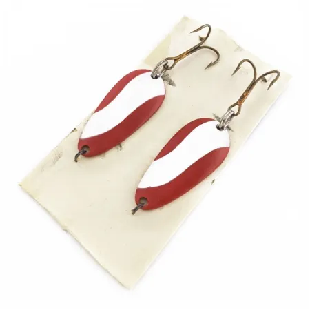 Strisce di smalto rosso e bianco creano una finitura ad alto contrasto sulla faccia di questi ondulanti Glen Evans Spoon. Ogni esca misura 1 1/2" (3,8 cm) di lunghezza e pesa 3/16 oz (6 g). L'interno del corpo in metallo stampato espone una superficie in rame nudo, fornendo un riflesso metallico opposto al lato verniciato. Identificato dal codice prodotto 24601, questo set include due esche identiche mai usate. Un'ancoretta singola è montata sulla coda del profilo a goccia. Sono visibili piccole impronte del processo di produzione dove il metallo è stato formato.