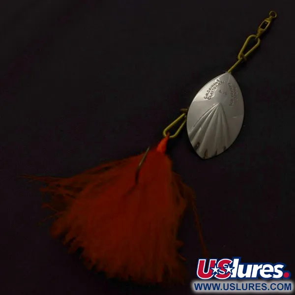 Un peso leggero di 7g (1/4 oz) caratterizza questo G.M. Skinner 4, un design che vanta un brevetto canadese risalente al 1874. La paletta con finitura al nichel è elegantemente scanalata per riflettere la luce e presenta l'iconica stampigliatura del produttore che ne indica l'origine a Clayton, N.Y. Con una lunghezza totale di 10 cm (4"), l'assemblaggio è completato da un amo piumato rosso-arancio che aggiunge un tocco di colore al profilo metallico. L'armatura in filo di ottone e la girella sono estremamente pulite, conferendo a questa rarità una valutazione dello stato di conservazione di 5/5. Catalogato con il codice prodotto 24225, questo artificiale dimostra la precisione della prima manifattura nordamericana attraverso la sua distintiva scanalatura e la costruzione robusta.