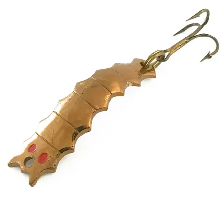 Scaglie di rame segmentate definiscono il corpo di questo ondulante unico in stile larva, prodotto negli USA. L'Al's Goldfish Helgy, codice prodotto 6650, presenta un profilo curvo progettato per imitare gli insetti acquatici. Lungo 4,5 cm (1 3/4"), il corpo metallico esibisce profonde tonalità di rame accentuate da due distinti punti rossi vicino all'occhiello di fissaggio. Con un peso di 5,5 g (3/16 oz), questo esemplare è un ottimo esempio di produzione americana di attrezzatura da pesca, progettato principalmente per il lancio in torrenti o piccoli specchi d'acqua. La componentistica è in forma eccellente, con un robusto anellino spaccato che collega una classica ancoretta con finitura bronzo. Questo artificiale è in condizioni 5/5, mostrando una finitura lucida e uniforme sulla sua superficie zigrinata.