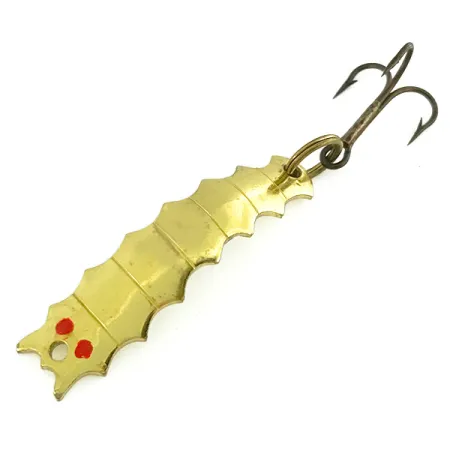 Segmentato lungo tutta la sua lunghezza per imitare la forma larvale di un hellgrammite, questo ondulante metallico vintage tonalità ottone è un pezzo unico della storia dell'attrezzatura americana. Al's Goldfish ha prodotto questo Goldfish Helgy, identificato dal codice prodotto 7244, con un profilo distintamente curvo e intagliato. Misurando 4,5 cm (1 3/4"), l'esca presenta due punti rossi dipinti a mano sulla testa che fungono da occhi, situati appena sopra l'attacco della lenza anteriore. Il retro del corpo è chiaramente stampato con "GOLDFISH HELGY", mantenendo la tipografia pulita tipica della produzione della marca a metà del secolo negli USA. Con un peso di 4,5 g (3/16 oz), questo esemplare è in condizioni 5/5, mostrando una superficie brillante e riflettente. L'attrezzatura consiste in un singolo amo triplo con finitura in bronzo fissato tramite un anellino spaccato sulla coda, pronto per il lancio in ruscello o stagni rocciosi.