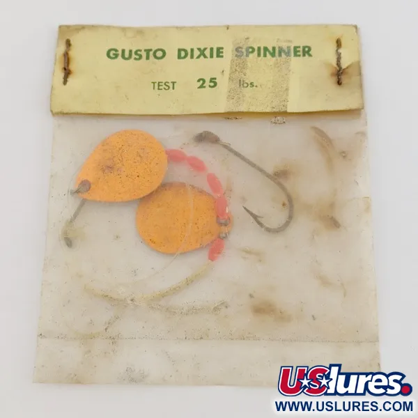 Due palette arancioni a forma di goccia definiscono il profilo di questo cucchiaino rotante Gusto Dixie Spinner da 1/16 oz (2 g). Sulla confezione vintage è riportata una resistenza di 25 libbre, il che suggerisce un apparato robusto per un'esca così compatta. Perline rosse separano le due palette lungo l'asse metallico, aggiungendo un elemento visivo ad alto contrasto alla vernice arancione brillante. Prodotto dalla Gusto Fishing Tackle Co. di Binghamton, N.Y., questo articolo ha il codice prodotto 24485. L'esemplare è inutilizzato nella sua confezione originale spillata, esattamente come uscito dalla fabbrica. Grandi ami singoli sono già montati dietro le palette rotanti per un uso immediato.