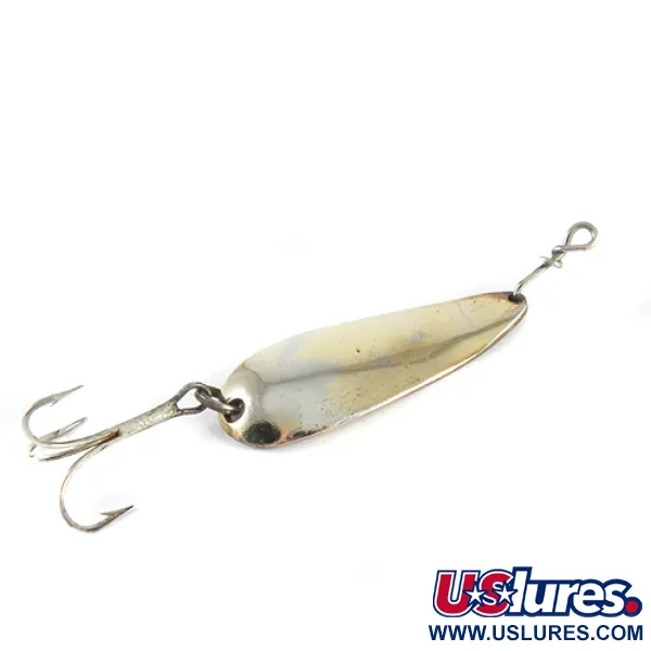 Il peso di 12,5 g (2/5 oz) assicura che questo ondulante Hagen's raggiunga rapidamente la profondità quando viene lanciato in acque correnti. Direttamente stampato nel metallo sul lato concavo compare la scritta «HAGEN BAIT CO. MILW. WIS.», un richiamo alla produzione a Milwaukee, USA. Il corpo con finitura dorata misura 5 cm (2") e mostra i segni di usura di una valutazione dello stato 3/5, con la superficie che ha affrontato molti lanci. La dotazione include un classico amo triplo su un anellino spaccato e un moschettone in punta per un collegamento sicuro della lenza. Identificato dal codice prodotto 1549, l'ondulante presenta un profilo semplice e pulito, ottimizzato per la massima durata durante le lunghe sessioni in acqua.