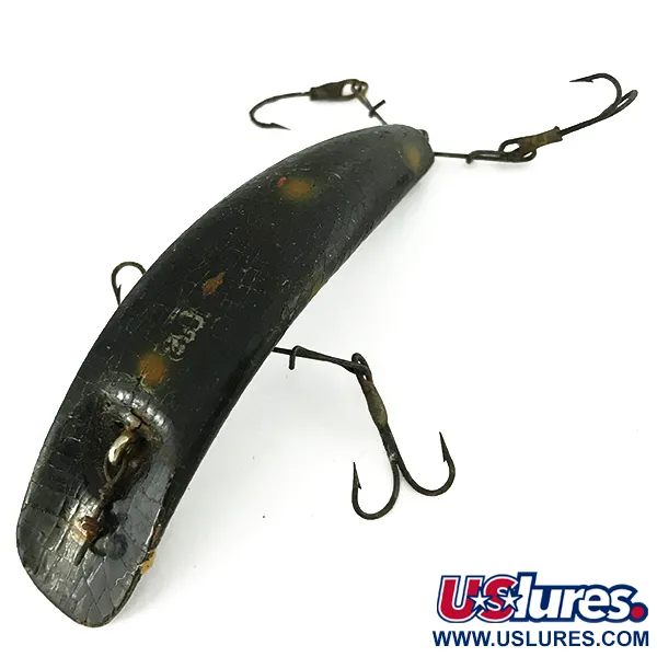 Con una lunghezza esatta di 9 cm (3 1/2"), il profilo curvo in legno di questo Helin FlatFish mette in mostra l'artigianato classico della prima produzione di Detroit. Una base nera decorata con punti giallo-arancio distribuiti offre un contrasto elevato, una livrea apprezzata da tempo per varie condizioni in acqua dolce. Questo modello da 10 g (1/3 oz), identificato dal codice prodotto 7127, presenta il tradizionale sistema spreader-bar di Helin, progettato per massimizzare le allamate mantenendo il bilanciamento previsto dell'esca durante la traina lenta. La finitura superficiale è valutata 4/5, mostrando linee sottili e segni del tempo sulla superficie del legno che riflettono il suo viaggio tra le cassette da pesca. Ogni occhiello e amo rimane intatto, evidenziando la robusta qualità costruttiva per cui Helin Tackle era nota prima della transizione ai materiali plastici. I pescatori li utilizzavano originariamente per trote e lucci, facendo affidamento sulle prestazioni a bassa velocità dettate dall'esclusivo design della testa a faccia piatta.